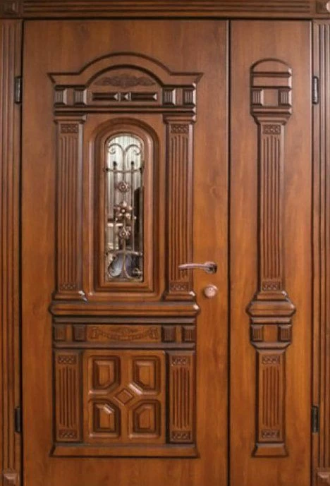 Поскольку в большинстве случаев устанавливаемые на входе в коттедж двустворчатые двери являются еще и предметом интерьера, украшающим здание, их дизайну предается особое значение. Эти двери, как правило, отделываются атмосферостойким МДФ, натуральным шпоном, массивом. Эффектно на таких дверях смотрится витражный узор, применение ковки, зеркальных элементов. Вариантов декора входной двустворчатой двери масса, тут все зависит от пожеланий заказчика.